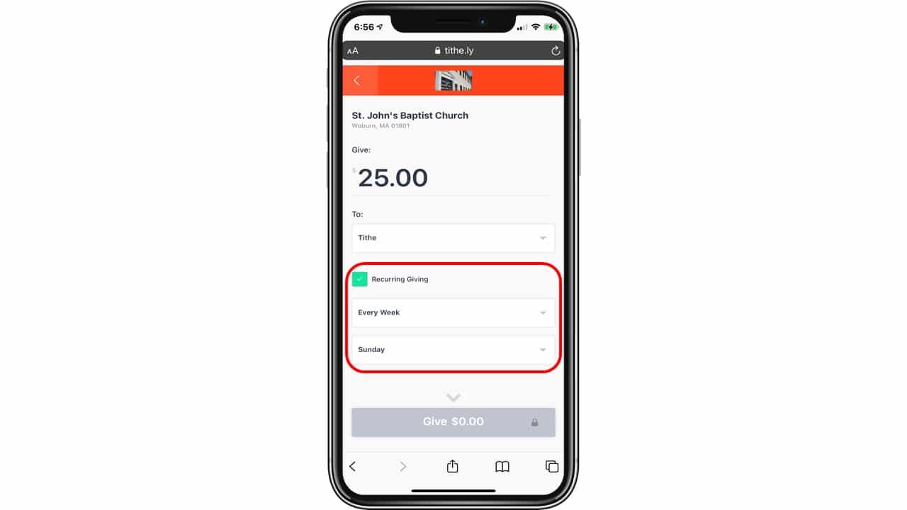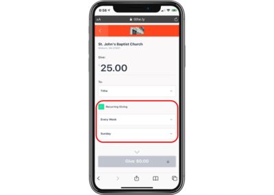 Step 5: (Optional) Select option to send Reoccurring Gift along with how often you want to send a donation and day of the week.